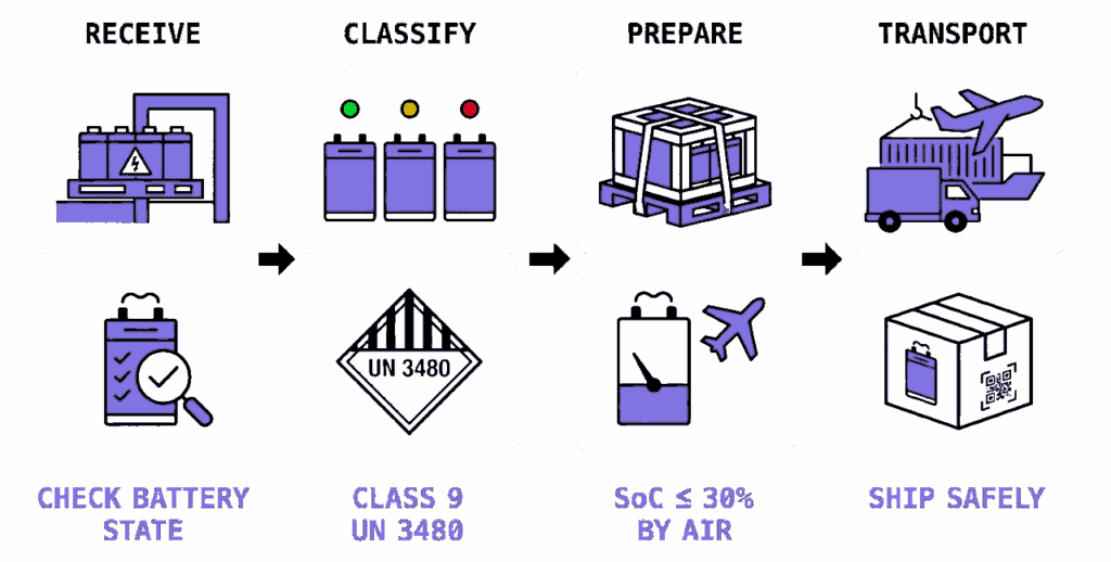 ClassĂ©es marchandises dangereuses classe 9 (UN 3480), les batteries Li-ion dĂ©montĂ©es sont rĂ©parties en trois niveaux : 🟢 saine, đźź  dĂ©gradĂ©e ou đź”´ dangereuse, chaque niveau dĂ©finissant des conditions de transport spĂ©cifiques.